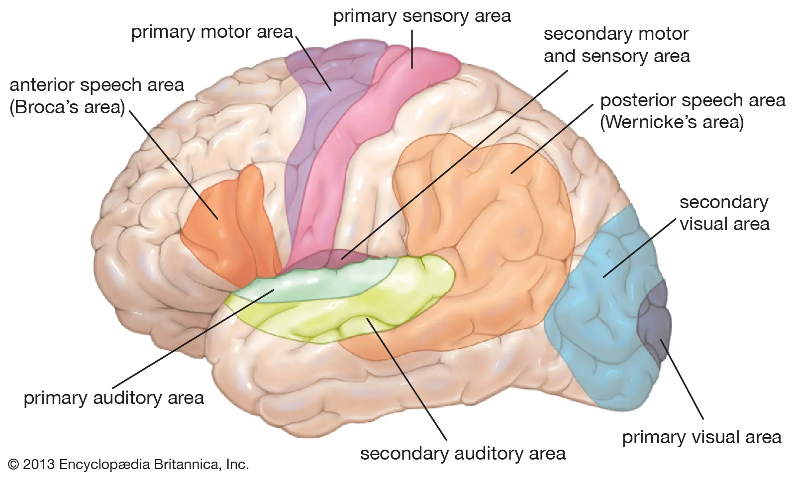 - 布罗卡氏区(Broca’s Area): 位于额下回后部。此区域负责语言表达。受损后,患者能理解他人说话,但自己说话极其费力,词汇断续(表达性失语),常为电报式语言,如“喝……水”。